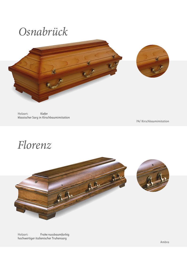 Wir halten für Sie eine Auswahl von Särgen in verschiedenen Ausführungen und Preislagen bereit. Die Palette reicht vom einfachen Standard bis zum aufwendigen Eichensarg. Auch moderne, kreative und individuelle Särge stehen zur Auswahl. Nachfolgend finden Sie eine Beispielhafte Auswahl an Särgen. Weitere Modelle sind bei uns vorrätig!